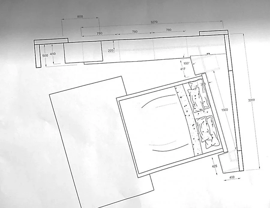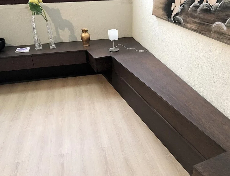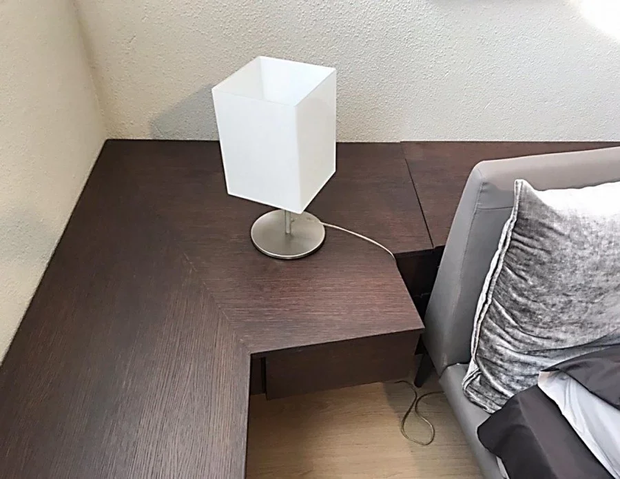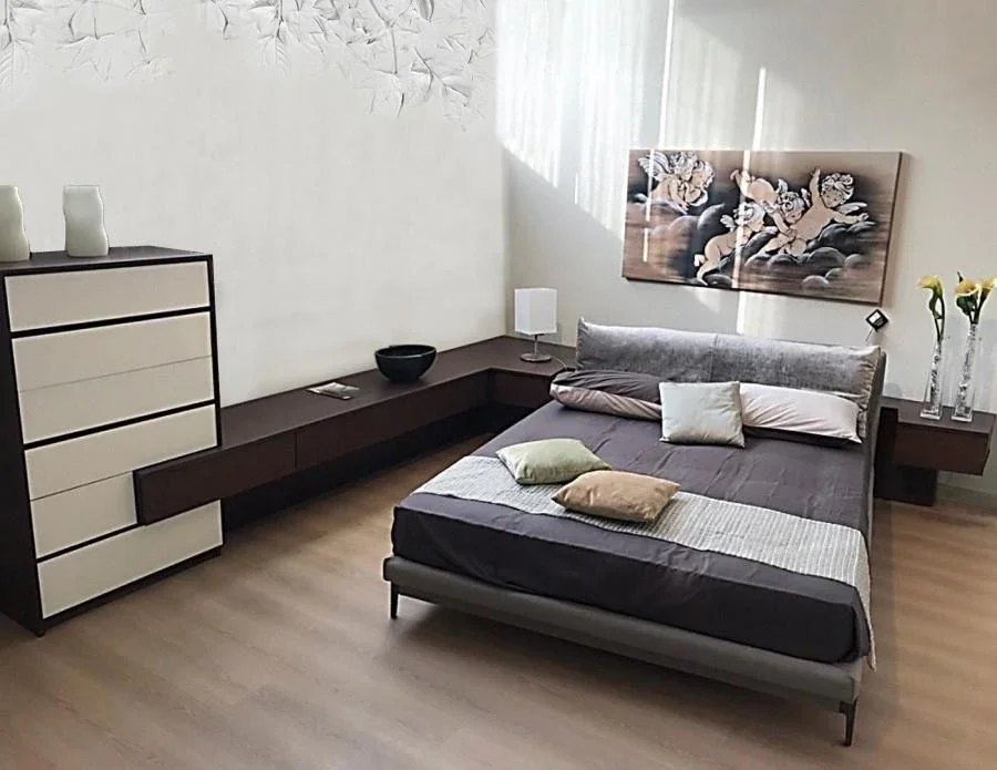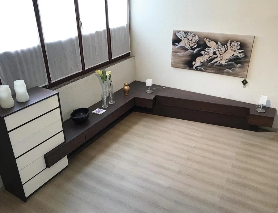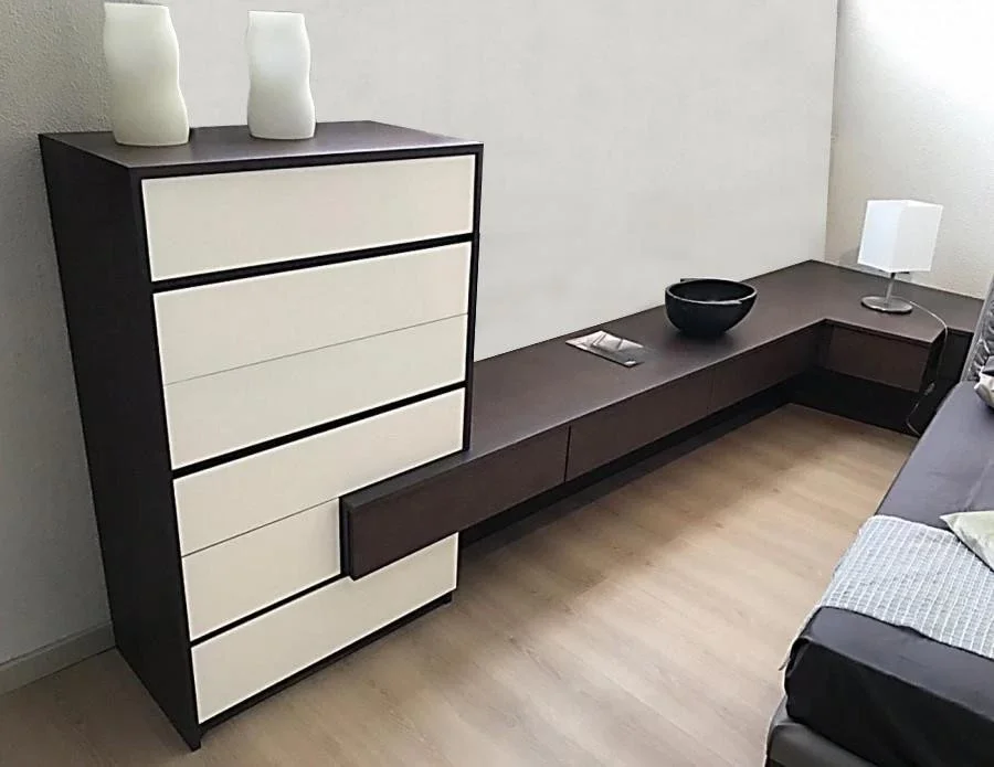 Composto da un settimanale da 80 cm, n. 3 cassettoni effetto sospeso da 80 cm, n. 2 cassetti lato letto da 42 cm, top di finitura sagomato fuorisquadra e struttura portante effetto sospeso.
