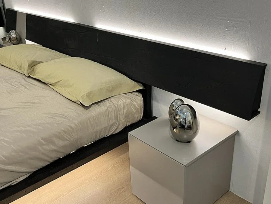 La testiera del letto è caratterizzata da pannellature retro in finitura Quercia 25, che aggiungono un tocco di calore e naturalezza all'ambiente. La presenza della rete inclusa assicura un supporto ottimale per il materasso, mentre l'illuminazione a LED integrata nella testata crea un'atmosfera accogliente e rilassante, perfetta per i momenti di relax serali.
