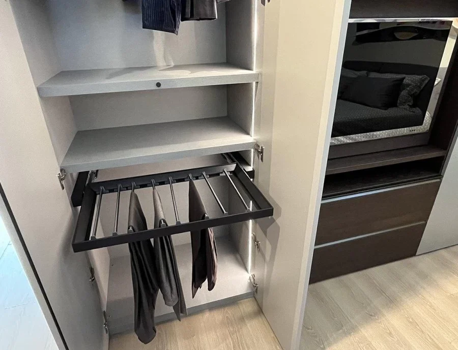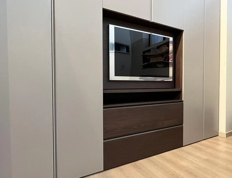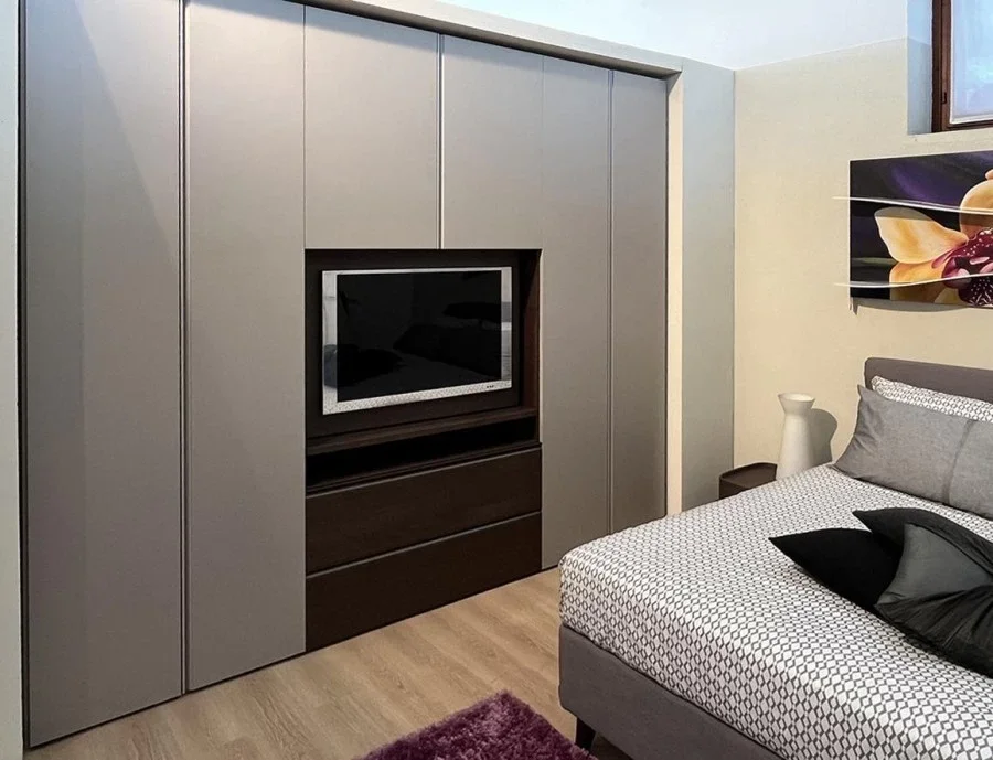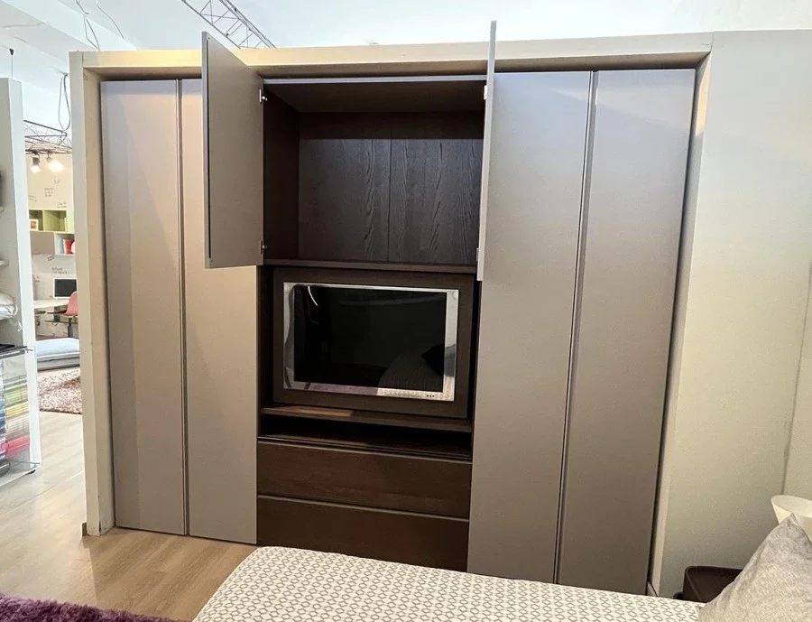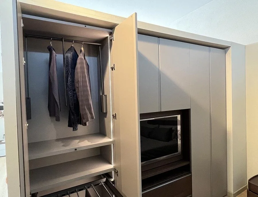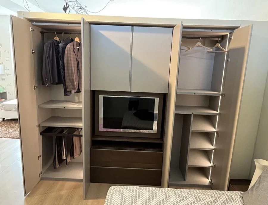 L'armadio con ante battenti modello Gola nato dall'estro artigiano dei mobilieri di Novamobili rappresenta una soluzione di design moderno capace di impreziosire gli ambienti della camera da letto, donando ordine, rigore e pulizia grazie ai numerosi e preziosi accessori ideati per garantire una pratica ed efficiente archiviazione. L'armadio anta battente Gola di Novamobili presenta una struttura realizzata in pregiato materiale Oxford e composta da 3 moduli. I primi due sono dotati di sistemi di apertura con ante battenti in Super Matt color Écru seta e sono attrezzati con ampi ripiani e tubi portabiti. Il terzo modulo è configurato come modulo porta Tv girevole, dotato di ante battenti, due pratici cestoni e una maniglia in bronzo ossidato. La capacità di stoccaggio di Gola by Novamobili viene amplificata da un vasto assortimento di attrezzature interne come: ripiani, tubi portabiti, cestoni, telaio per pantaloni estraibile, gruccia, porta scarpe. Per consentire a tutti i clienti che scelgono l'armadio battente Gola di usufruire di questa pratica soluzione anche durante le ore serali o nel cuore della notte, è stato installato un sistema di illuminazione a LED integrato con sensore e trasformatore. Se stai cercando un armadio ad anta battente dal design d'autore e dalle pregiate finiture, non lasciarti sfuggire Gola di Novamobili. Lo trovi a prezzo scontato sull'outlet MobiliDesignOcasioni.