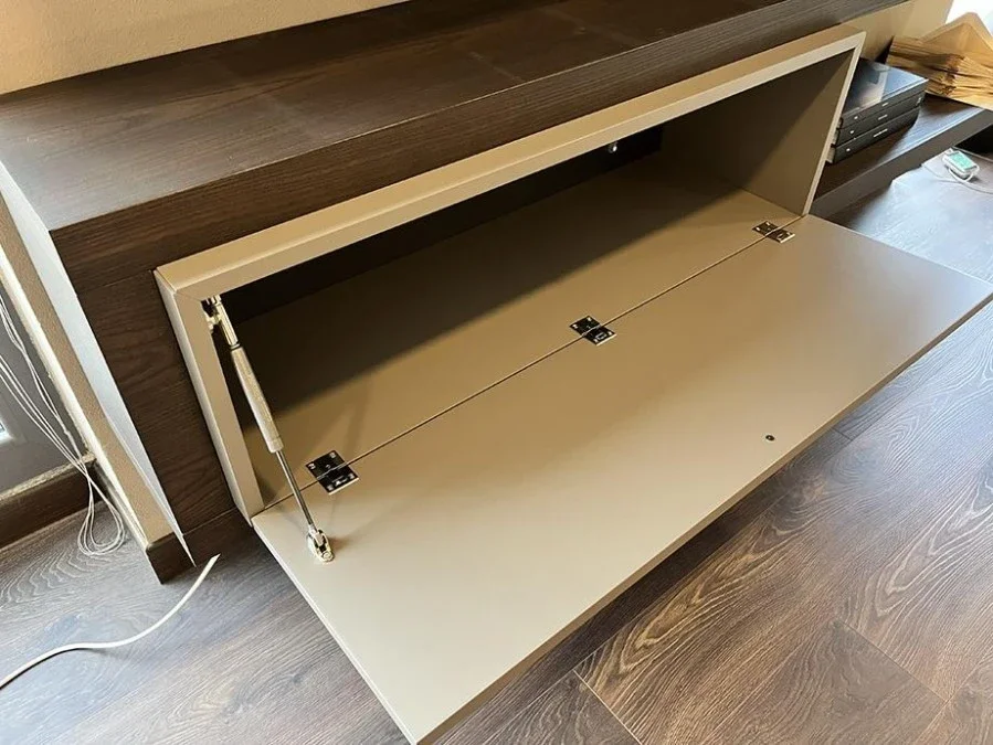 La struttura del Side System è caratterizzata da due ante scorrevoli, una centrale in laccato cemento con schienale e fianco coordinati, e una superiore più ampia. Queste ante non solo aggiungono un elemento estetico accattivante, ma offrono anche praticità grazie al pensile con anta a ribalta, ideale per riporre oggetti di uso quotidiano.