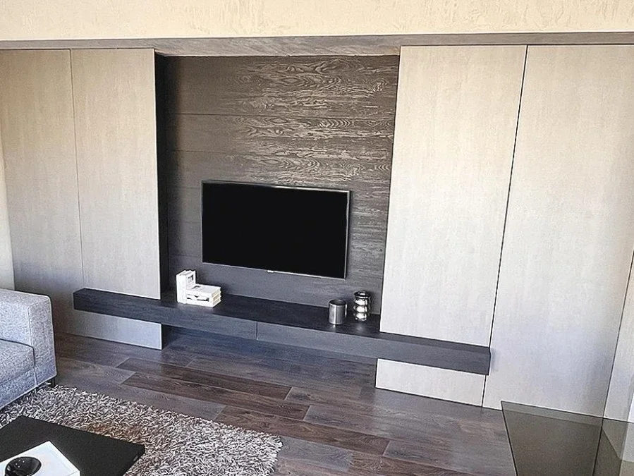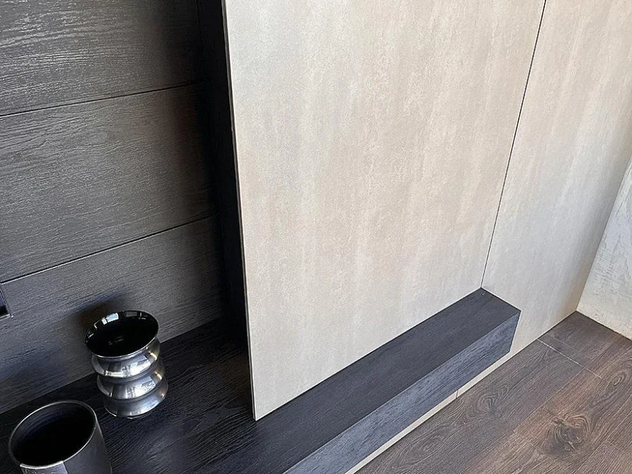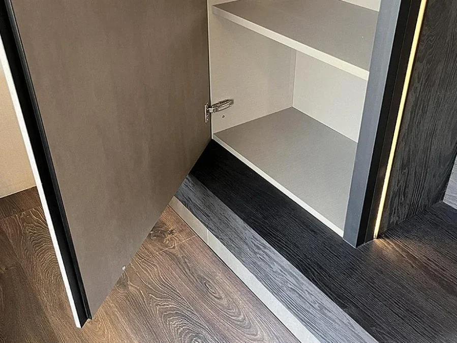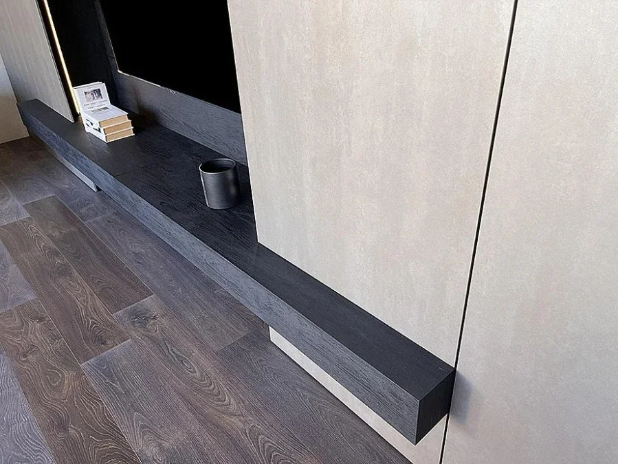 Un elemento distintivo di questo mobile è il mensolone, con uno spessore di 15 cm, realizzato con la tecnica del Folding. Questa lavorazione innovativa permette di creare forme senza bordature visibili, eliminando le giunzioni per un effetto estetico impeccabile.