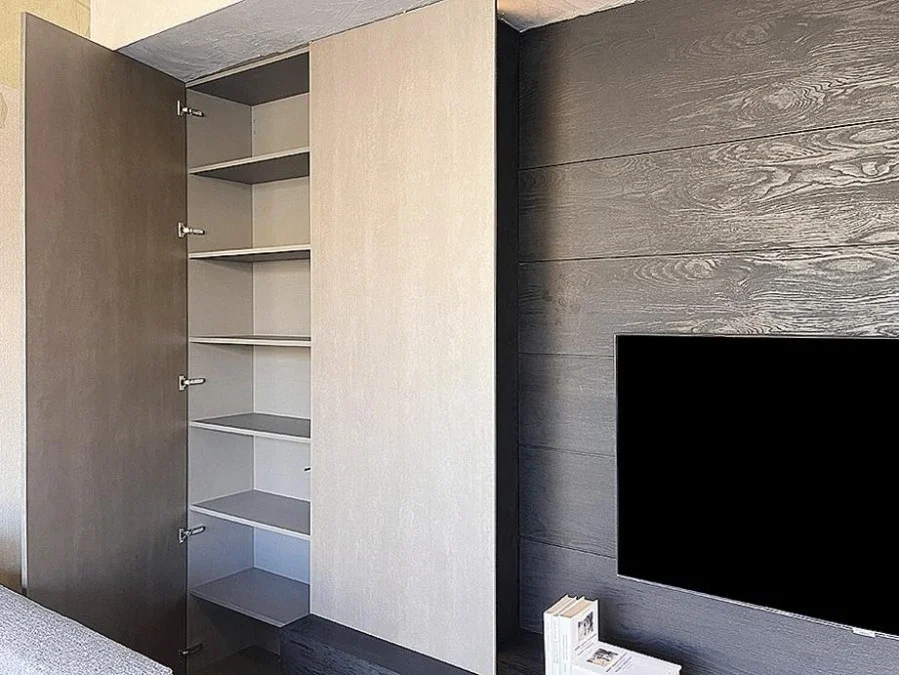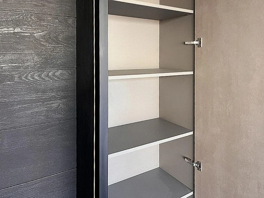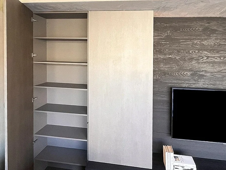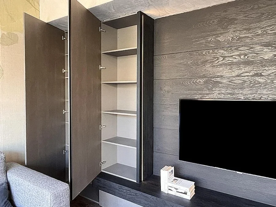 La struttura interna delle colonne è realizzata in finitura Texture, garantendo una resistenza e una qualità senza pari. Le quattro colonne da 75 cm con ante in Miltech IRON offrono ampio spazio per riporre oggetti, mantenendo l'ordine e la pulizia visiva del soggiorno.