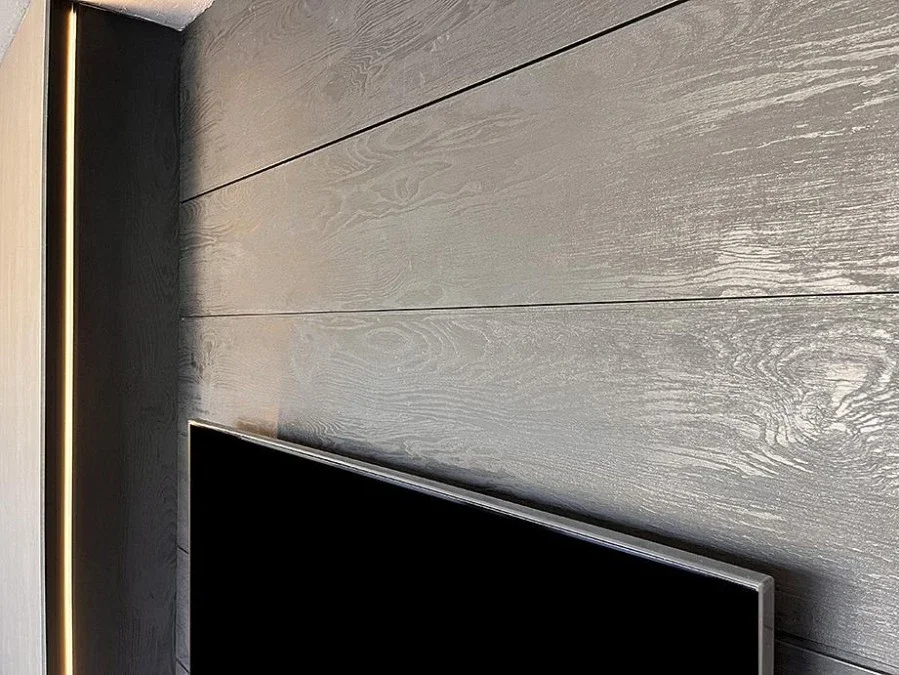 L'atmosfera è ulteriormente arricchita dai profili LED laterali integrati nella boiserie dogata, che aggiungono un tocco di luce soffusa e accogliente all'ambiente. Questo dettaglio non solo esalta il design del mobile ma contribuisce anche a creare un'atmosfera calda e invitante.