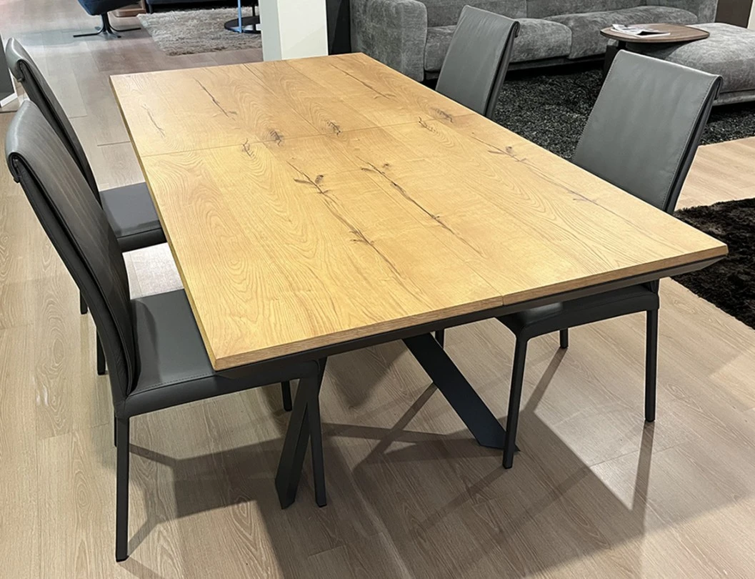 Il basamento centrale è costituito da una struttura in metallo bronzo MT97 che consente il libero posizionamento delle sedie. La finitura del top è in legno rovere vecchio naturale.