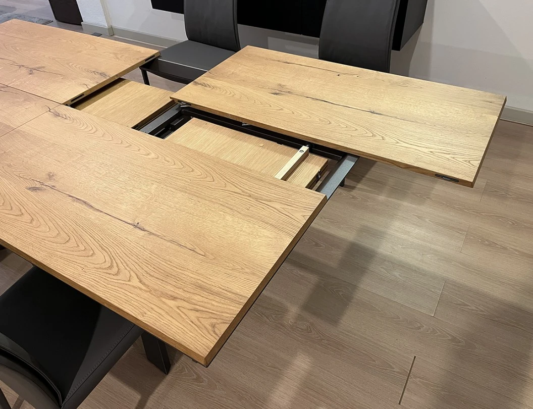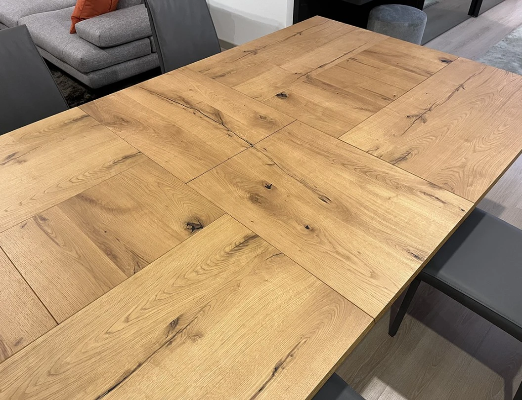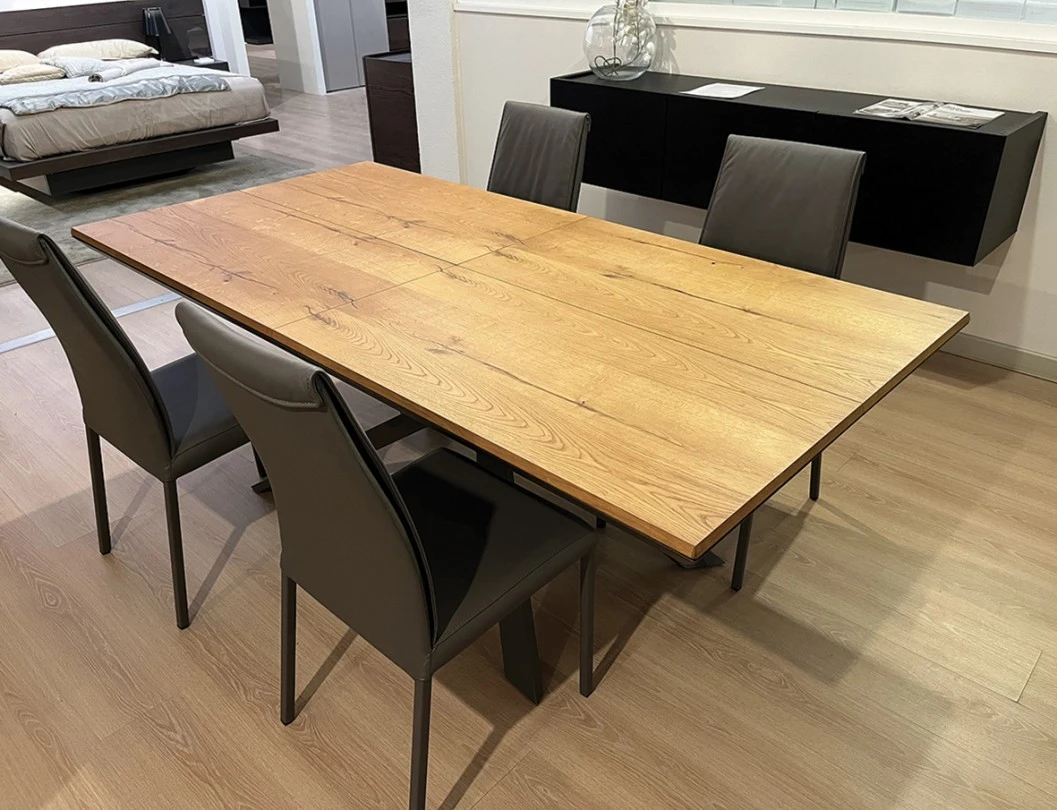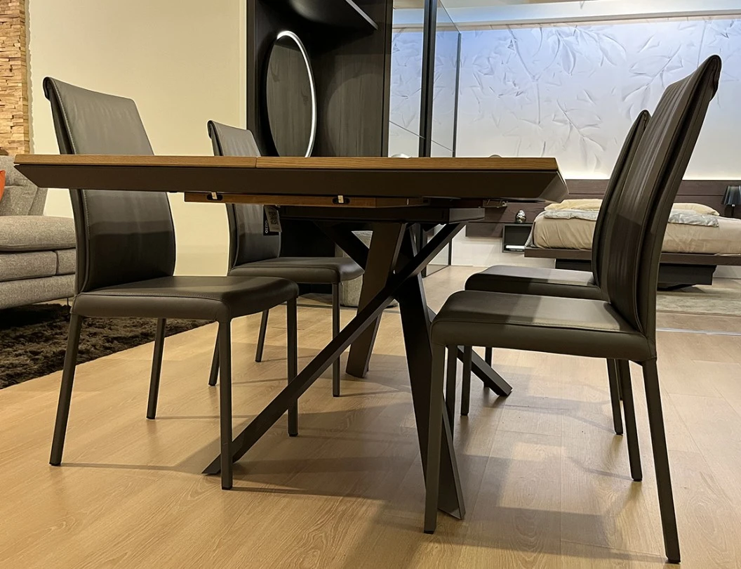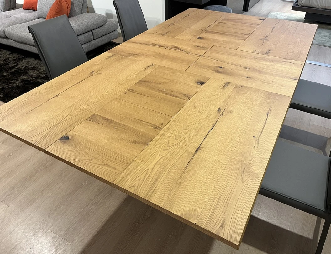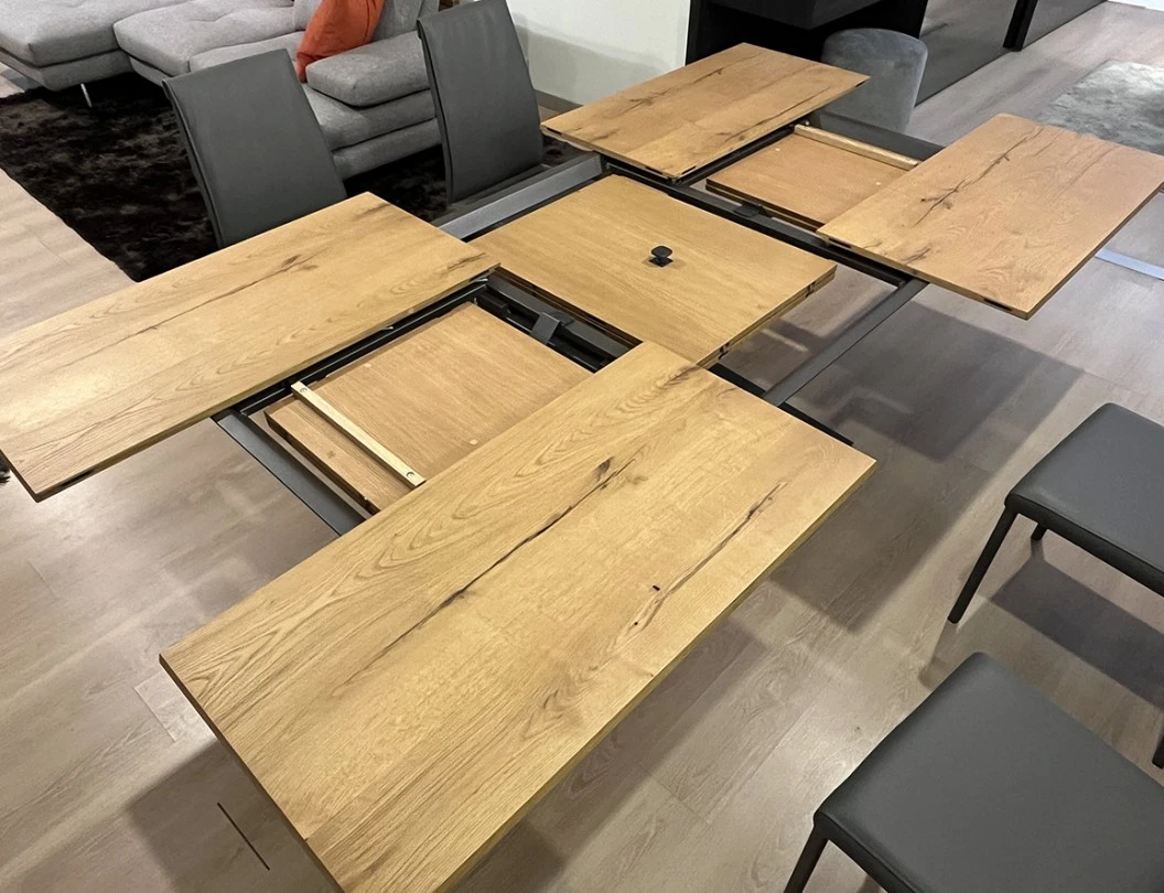 Il piano è diviso in quattro quadranti che scivolano verso l'esterno per liberare due allunghe centrali e altre due laterali, consentendo cosi di ottenere una maggiore capienza di posti a sedere e tantissimo spazio nel centro per posizionare le pietanze ed i centro tavola.