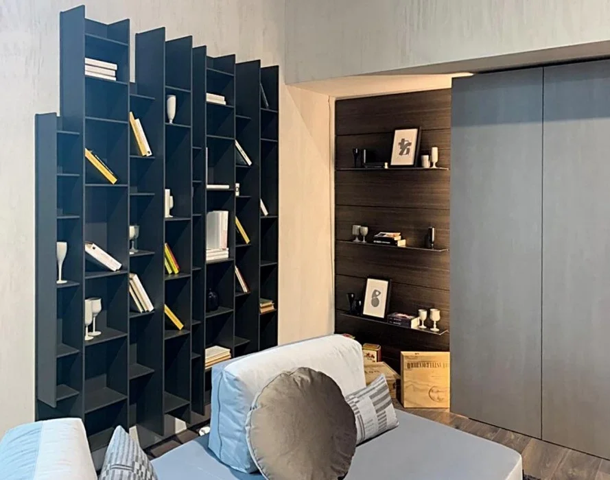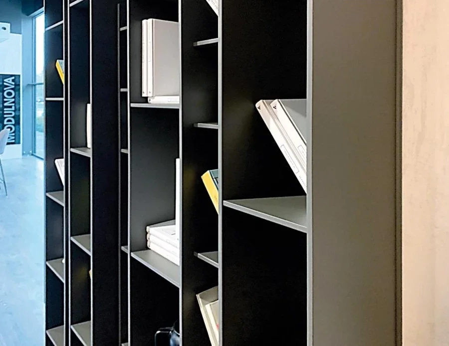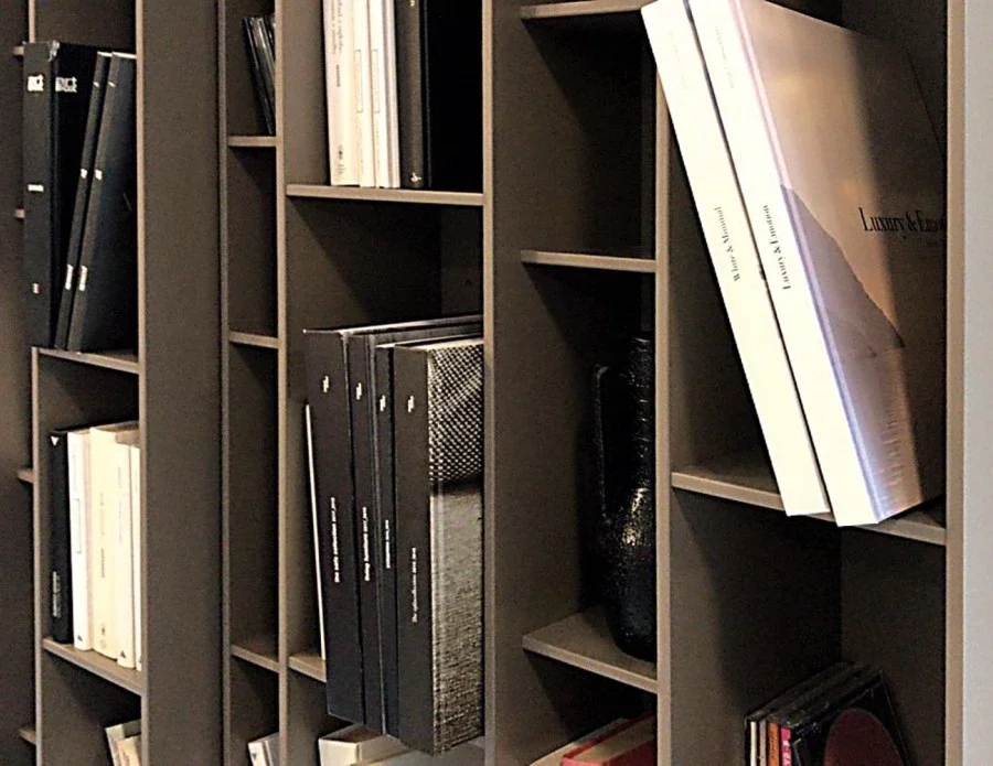 Libreria modulare Byblos di Ozzio, costituita da due moduli con struttura in MDF laccato e struttura di aggancio invisibile. Design: Studio Ozeta