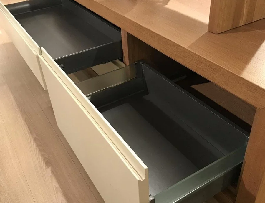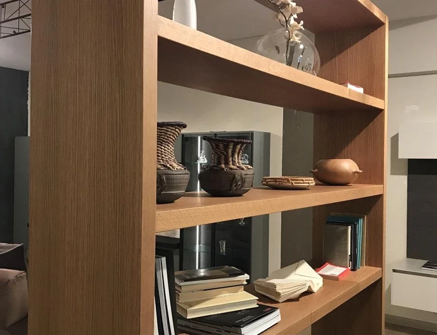 Finitura struttura: in listellare di pioppo spessore 25 mm, impiallacciato rovere tinto creta, con ante in MDF laccato opaco bianco.