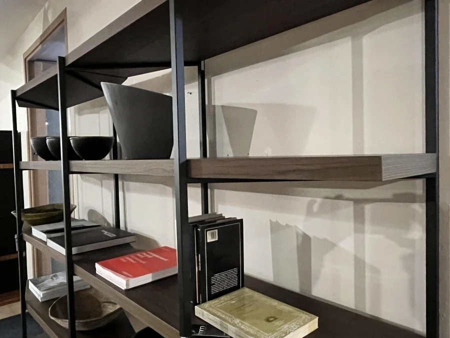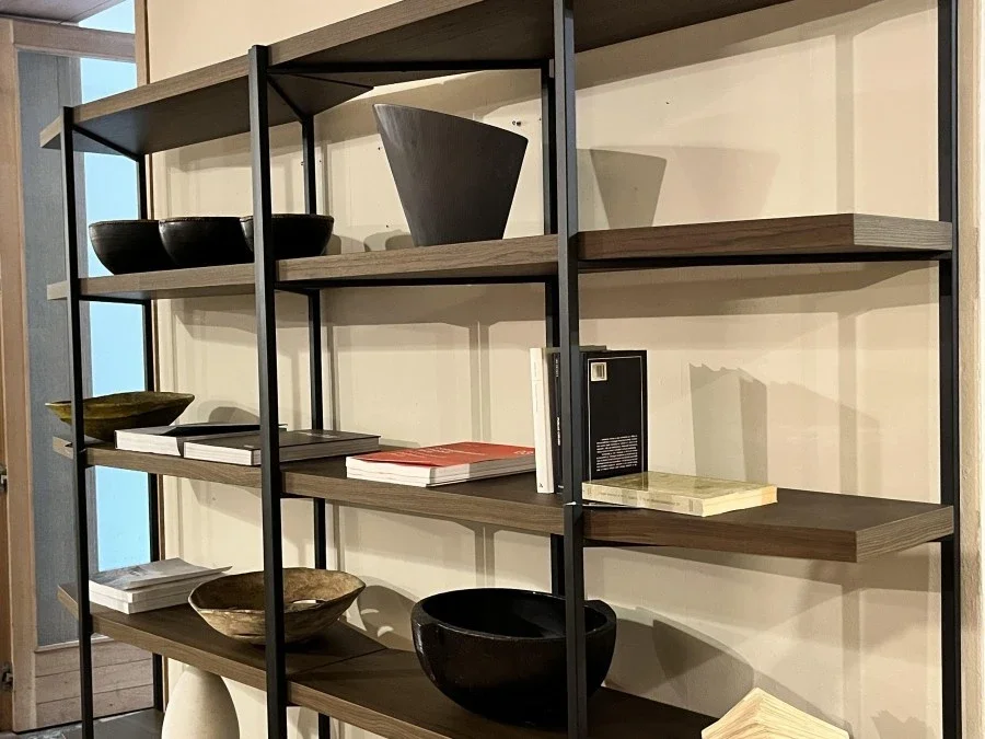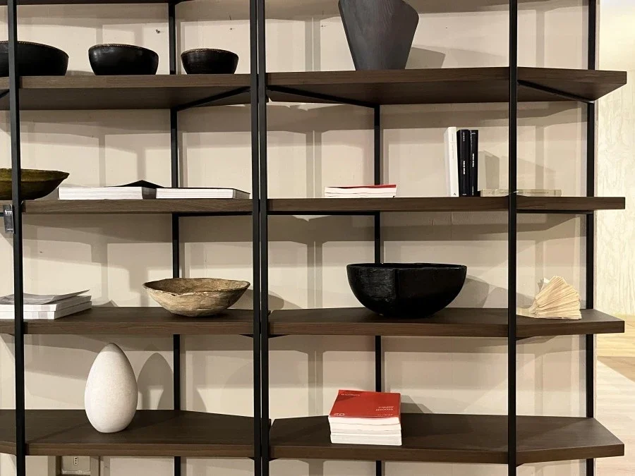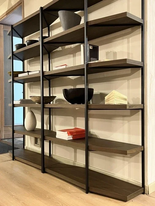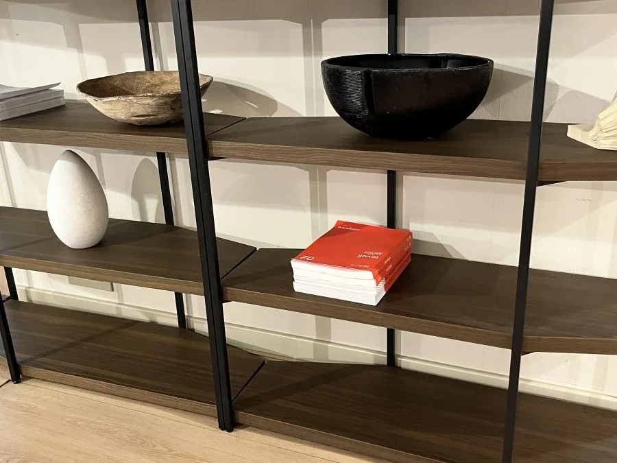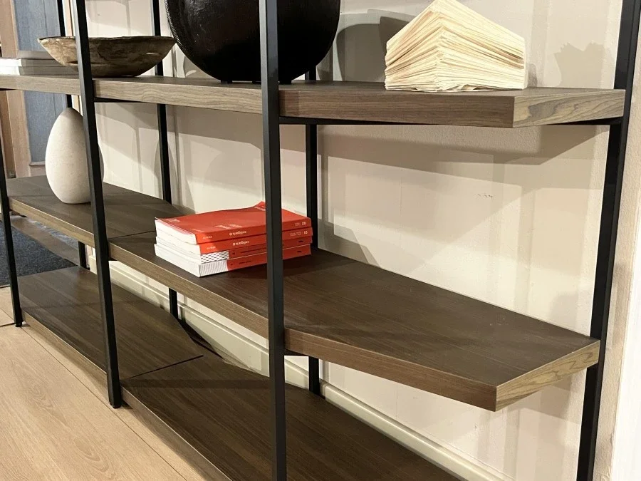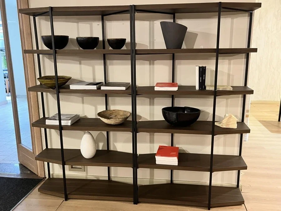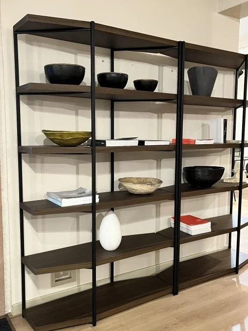 La struttura è in metallo verniciato nero opaco P15, mentre i sei ripiani sono in legno impiallacciato Smoke P12.